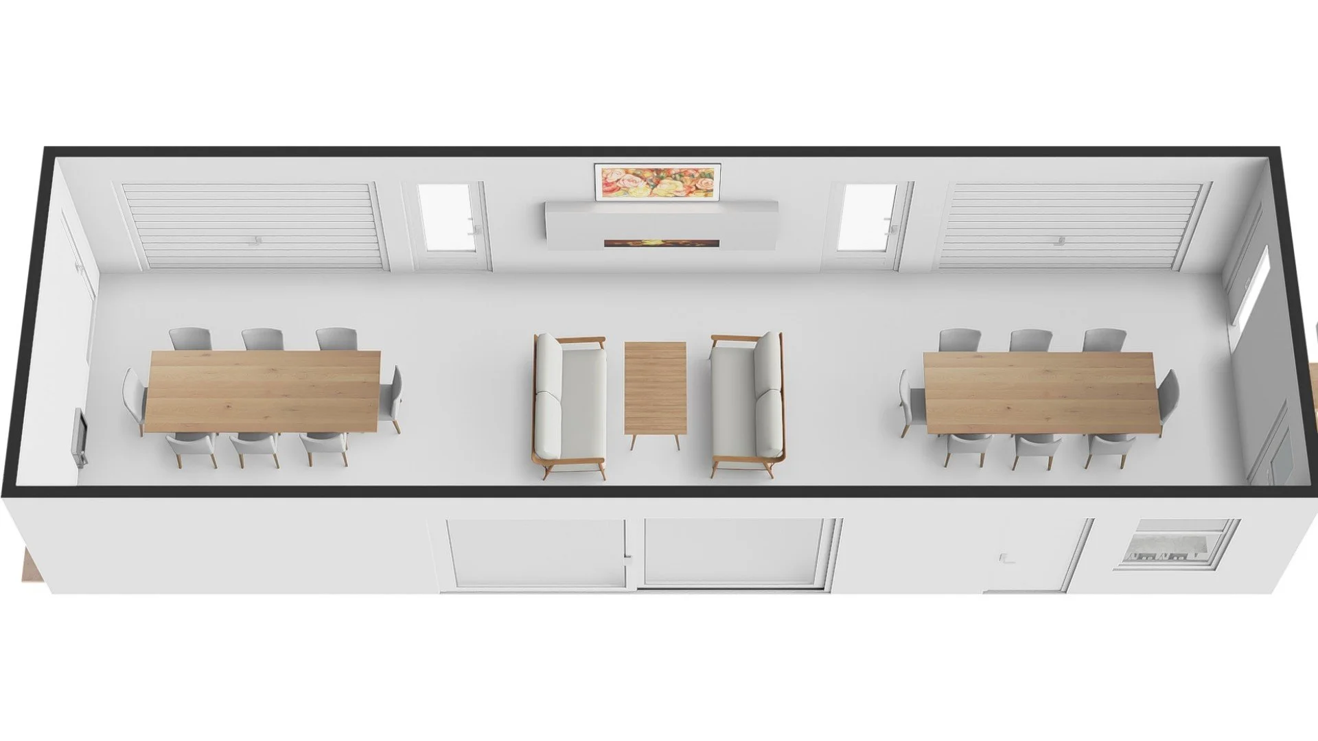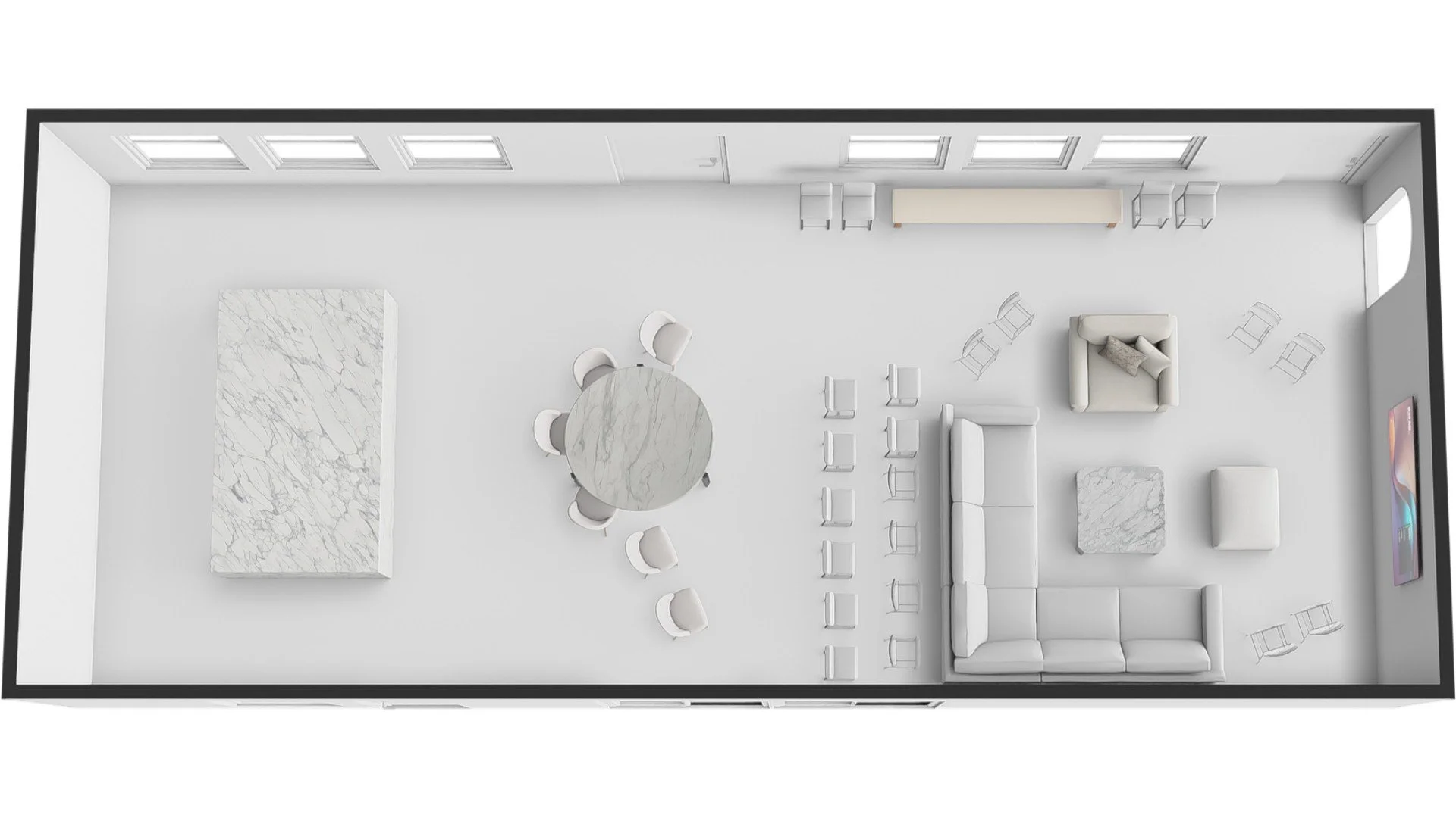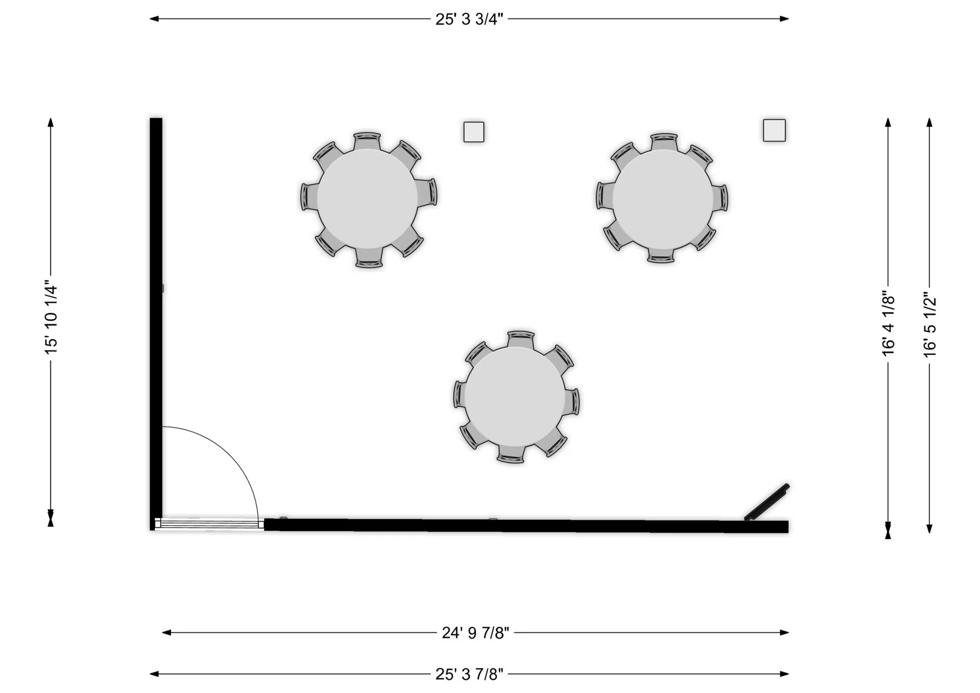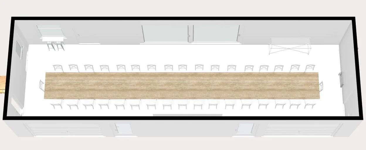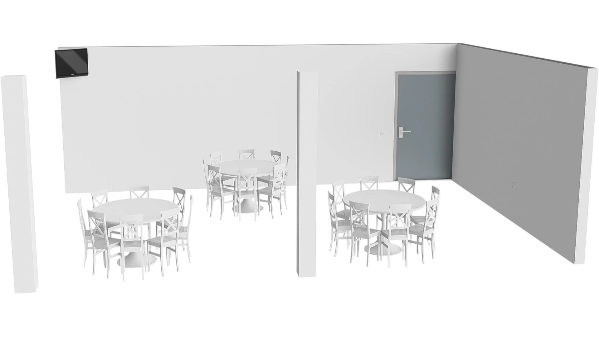 Seating for an additional 24 people as shown. Space can also be used without tables and chairs for food prep, beverages, photo booth, margarita machine, etc.